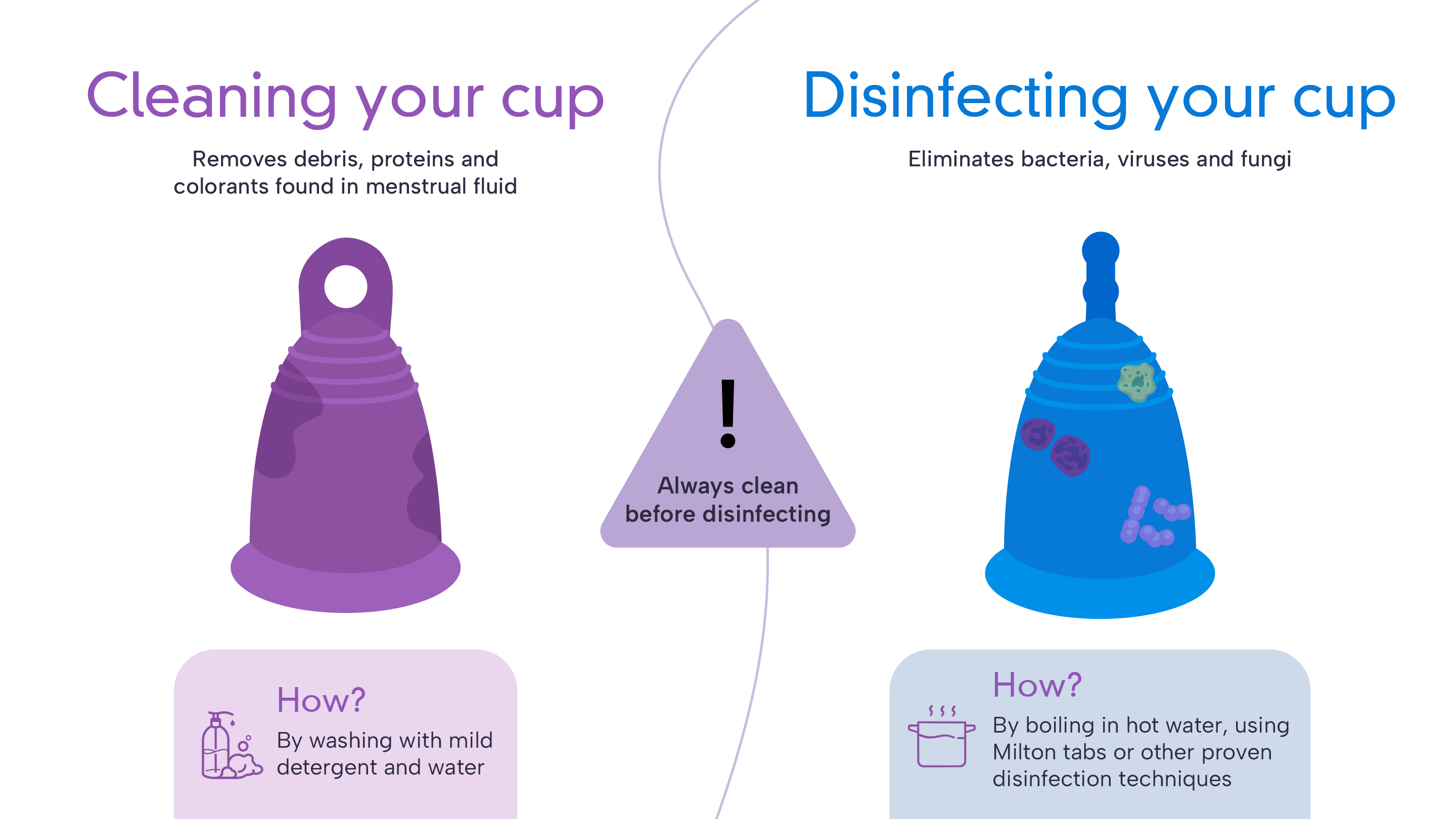 Always clean your menstrual cup thoroughly before disinfecting it.